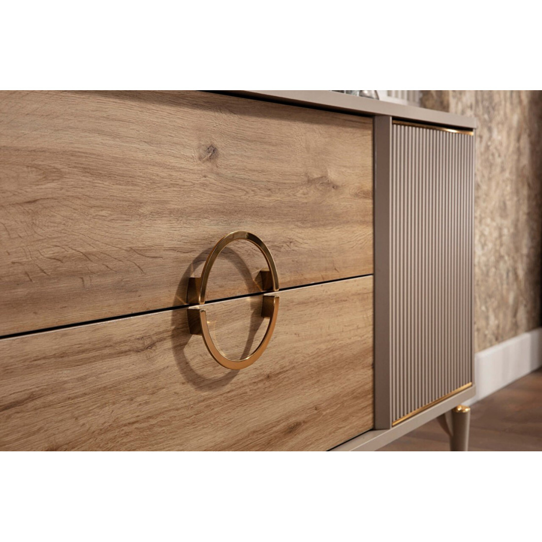 Тумба Санвито SANV-10 от турецкого производителя Bellona станет украшением Вашей гостиной, столовой, залы как в квартире. так и загородном доме. Достаточно длинная (185см),неглубокая (48см), но вместительная, она может использоваться как прилавок, буфет, комод. Тумба Sanvito имеет два глубоких ящика, а также внутренний потайной ящичек для столовых приборов или разных мелочей. Округлые, плавные формы тумбы прекрасно сочетаются с оригинальными ножками. Вертикальные линии фасадов кремового цвета в обрамлении золотистой каймы дополняют древесную фактуру центральных ящиков. Круглая золотистая ручка ящиков подчеркивает оригинальность дизайна.